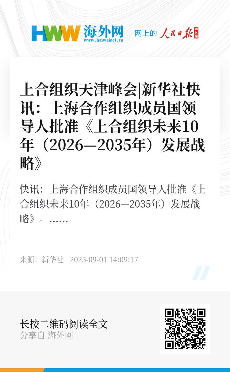 新华社快讯:上海合作组织成员国领导人批准《上合组织未来10年(2026—2035年)发展战略》。