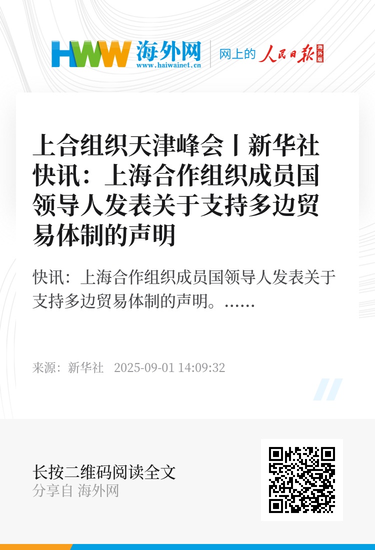 上合组织天津峰会丨新华社快讯:上海合作组织成员国领导人发表关于支持多边贸易体制的声明