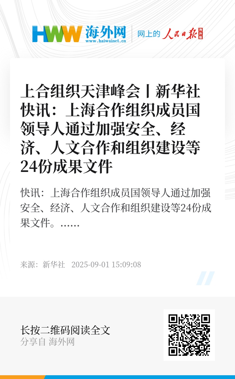 上合组织天津峰会丨新华社快讯:上海合作组织成员国领导人通过加强安全、经济、人文合作和组织建设等24份成果文件