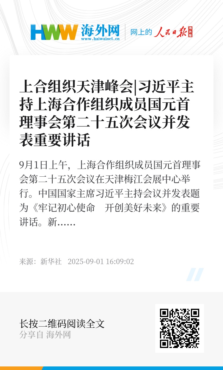 新华社天津9月1日电(记者丁锡国、邹伟)9月1日上午,上海合作组织成员国元首理事会第二十五次会议在天津梅江会展中心举行。中国国家主席习近平主持会议并发表题为《牢记初心使命 开创美好未来》的重要讲话。