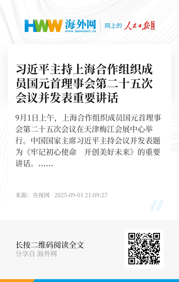 9月1日上午,上海合作组织成员国元首理事会第二十五次会议在天津梅江会展中心举行。中国国家主席习近平主持会议并发表题为《牢记初心使命 开创美好未来》的重要讲话。
