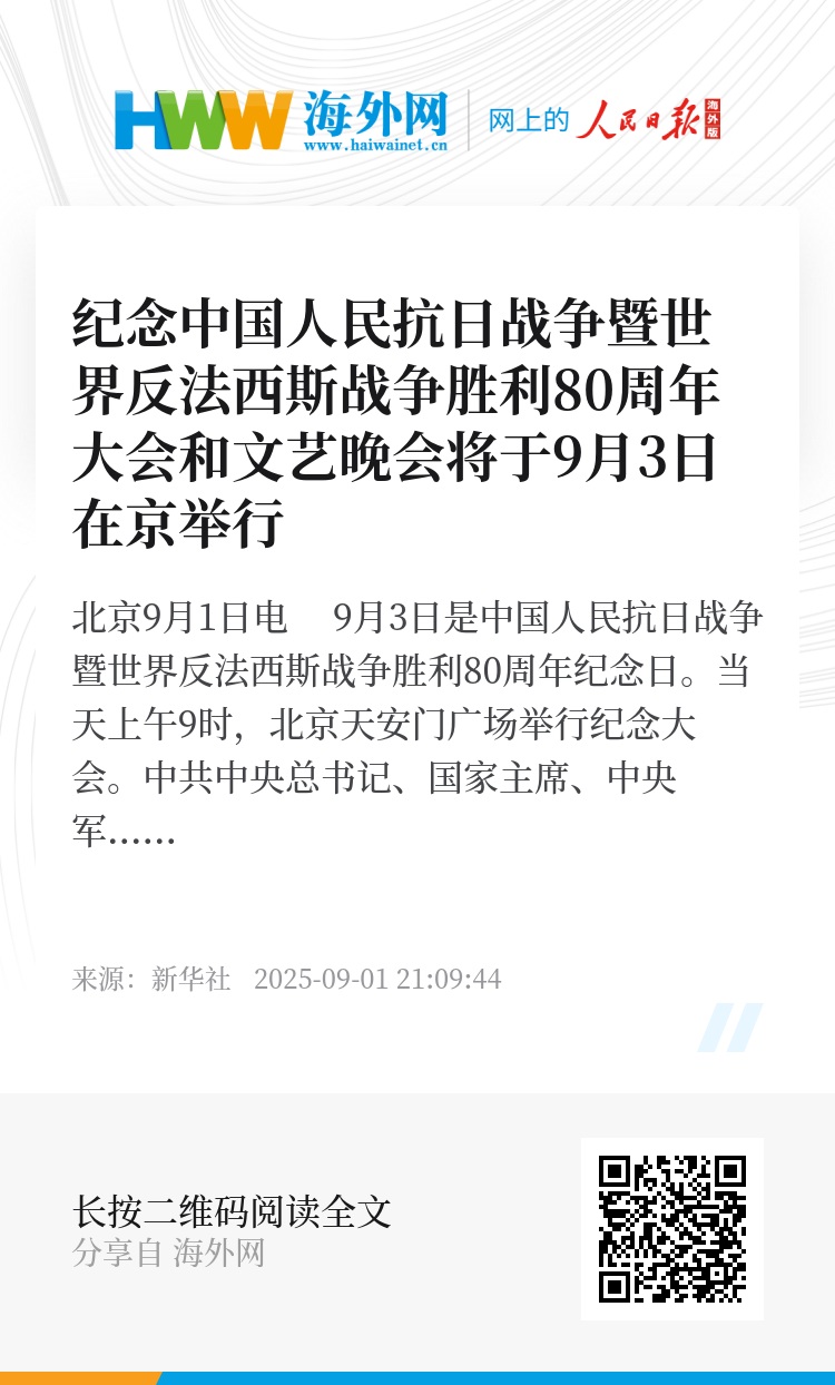 新华社北京9月1日电 9月3日是中国人民抗日战争暨世界反法西斯战争胜利80周年纪念日。当天上午9时,北京天安门广场举行纪念大会。中共中央总书记、国家主席、中央军委主席习近平将发表重要讲话并检阅部队。