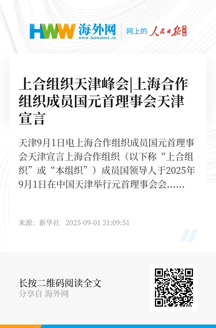 上海合作组织(以下称“上合组织”或“本组织”)成员国领导人于2025年9月1日在中国天津举行元首理事会会议,并发表宣言如下: