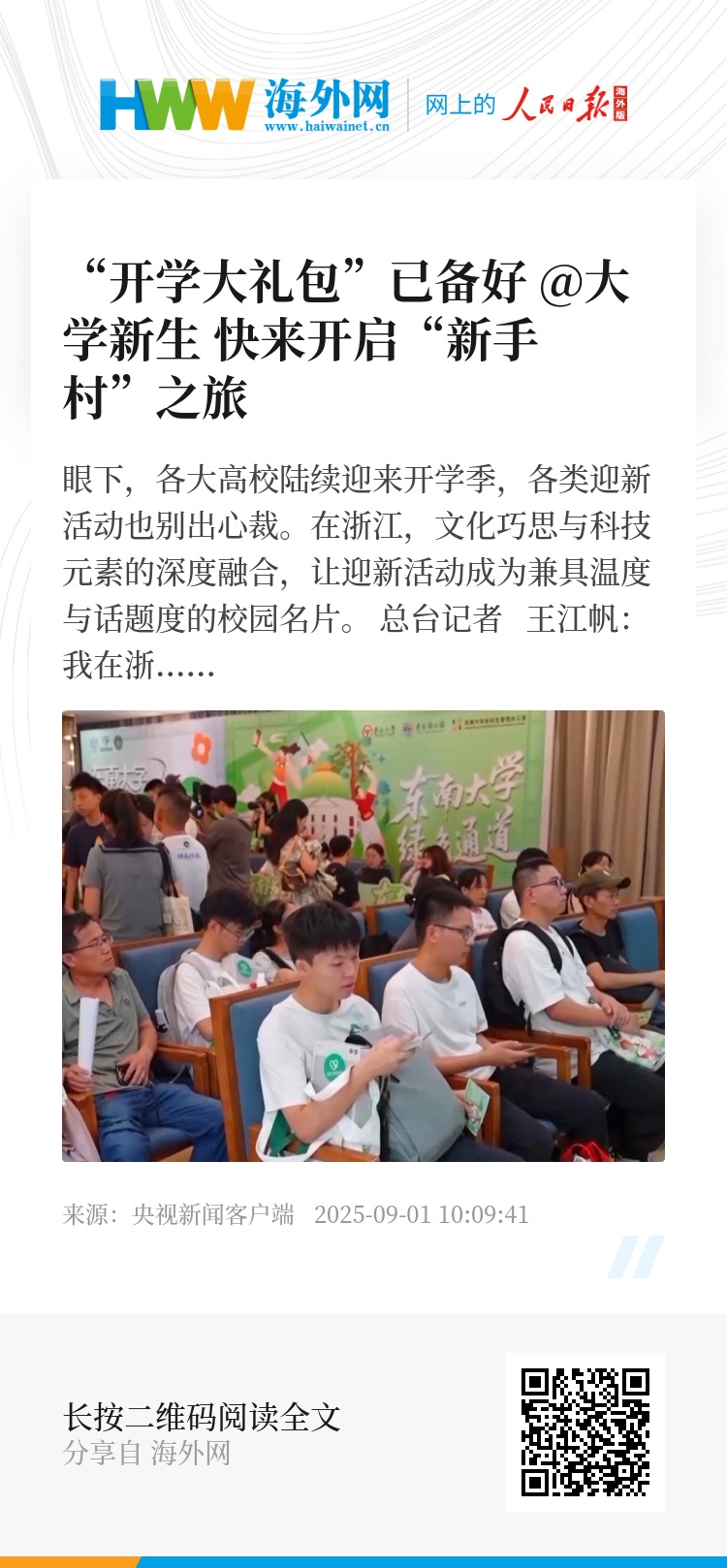 总台记者 王江帆:我在浙江大学的校门口,大家可以看到我身后有很多的学生和家长。今年的开学季,六千多名本科新生将在这里开启人生的新篇章。他们在“新手村”有什么奇遇,我们一起看看吧。
