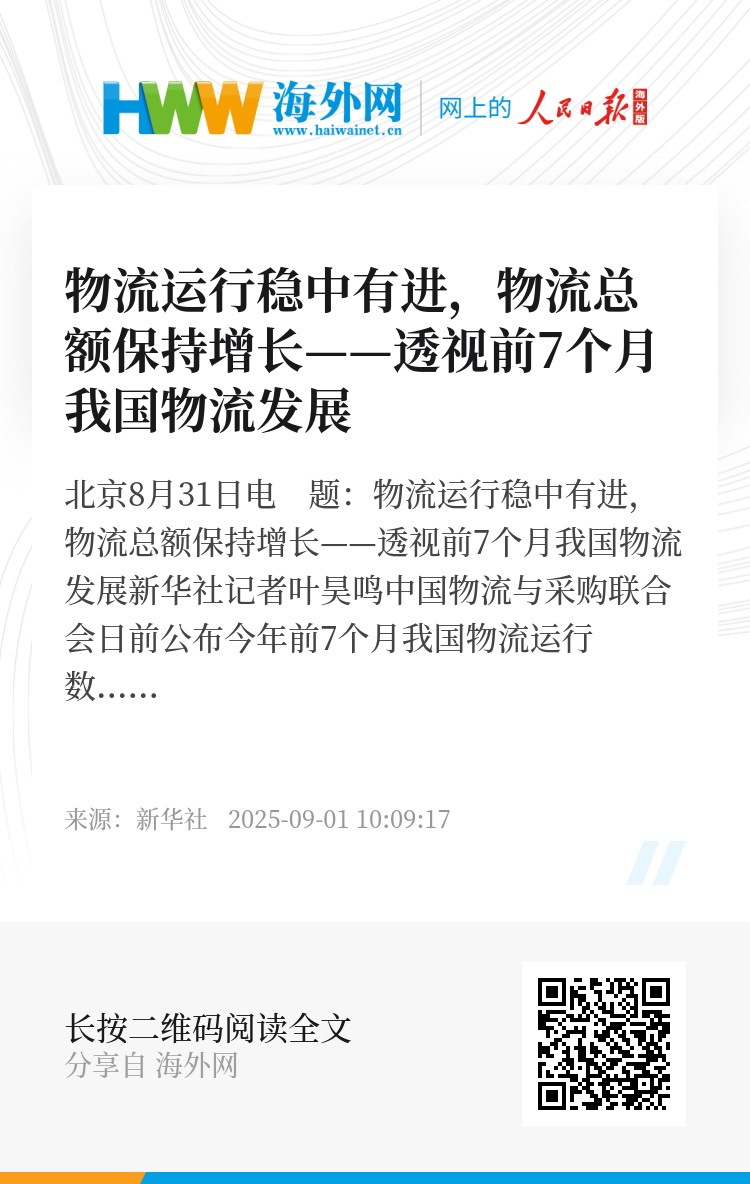 新华社北京8月31日电 题:物流运行稳中有进,物流总额保持增长——透视前7个月我国物流发展