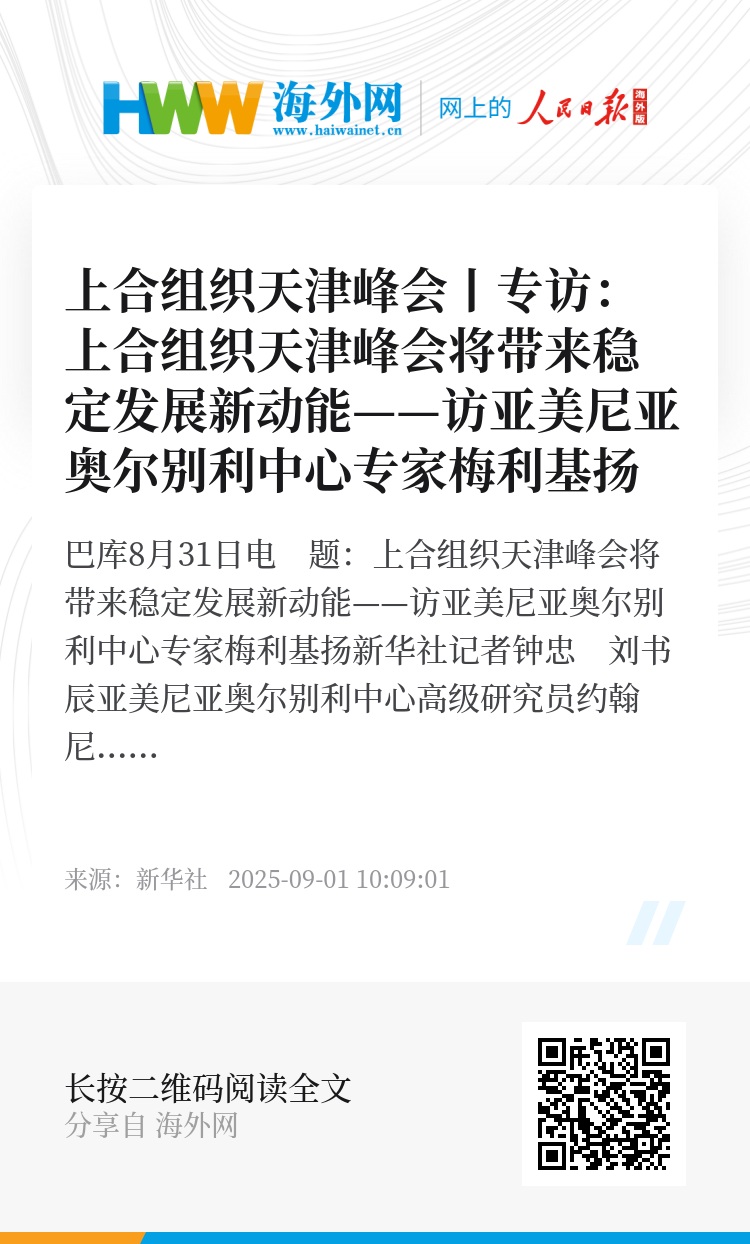新华社巴库8月31日电 题:上合组织天津峰会将带来稳定发展新动能——访亚美尼亚奥尔别利中心专家梅利基扬