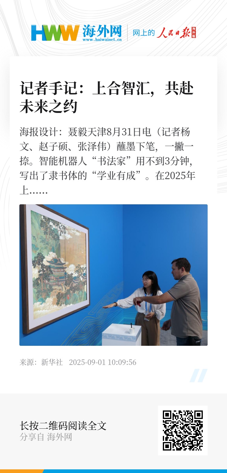 新华社天津8月31日电(记者杨文、赵子硕、张泽伟)蘸墨下笔,一撇一捺。智能机器人“书法家”用不到3分钟,写出了隶书体的“学业有成”。在2025年上海合作组织峰会新闻中心上演的这一幕,令围观的中外媒体记者连连赞叹。