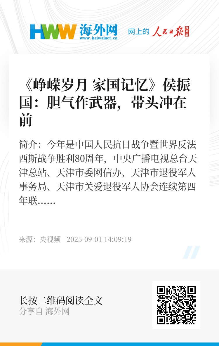 简介:今年是中国人民抗日战争暨世界反法西斯战争胜利80周年,中央广播电视总台天津总站、天津市委网信办、天津市退役军人事务局、天津市关爱退役军人协会连续第四年联合推出《峥嵘岁月 家国记忆》特别节目。口述难忘历史,追寻红色记忆,致敬英雄儿女。今天播出 《侯振国:胆气作武器 带头冲在前》。