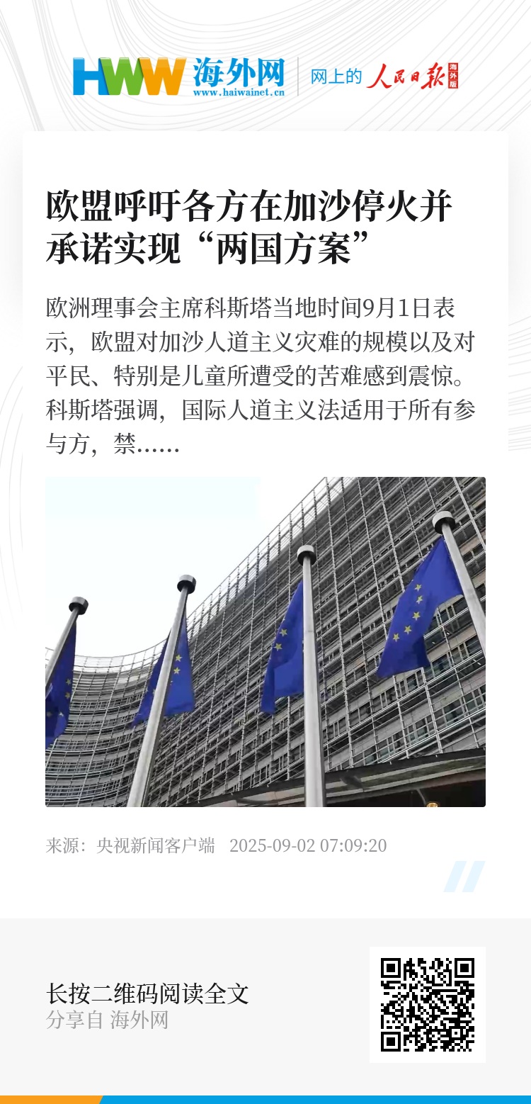 欧洲理事会主席科斯塔当地时间9月1日表示,欧盟对加沙人道主义灾难的规模以及对平民、特别是儿童所遭受的苦难感到震惊。