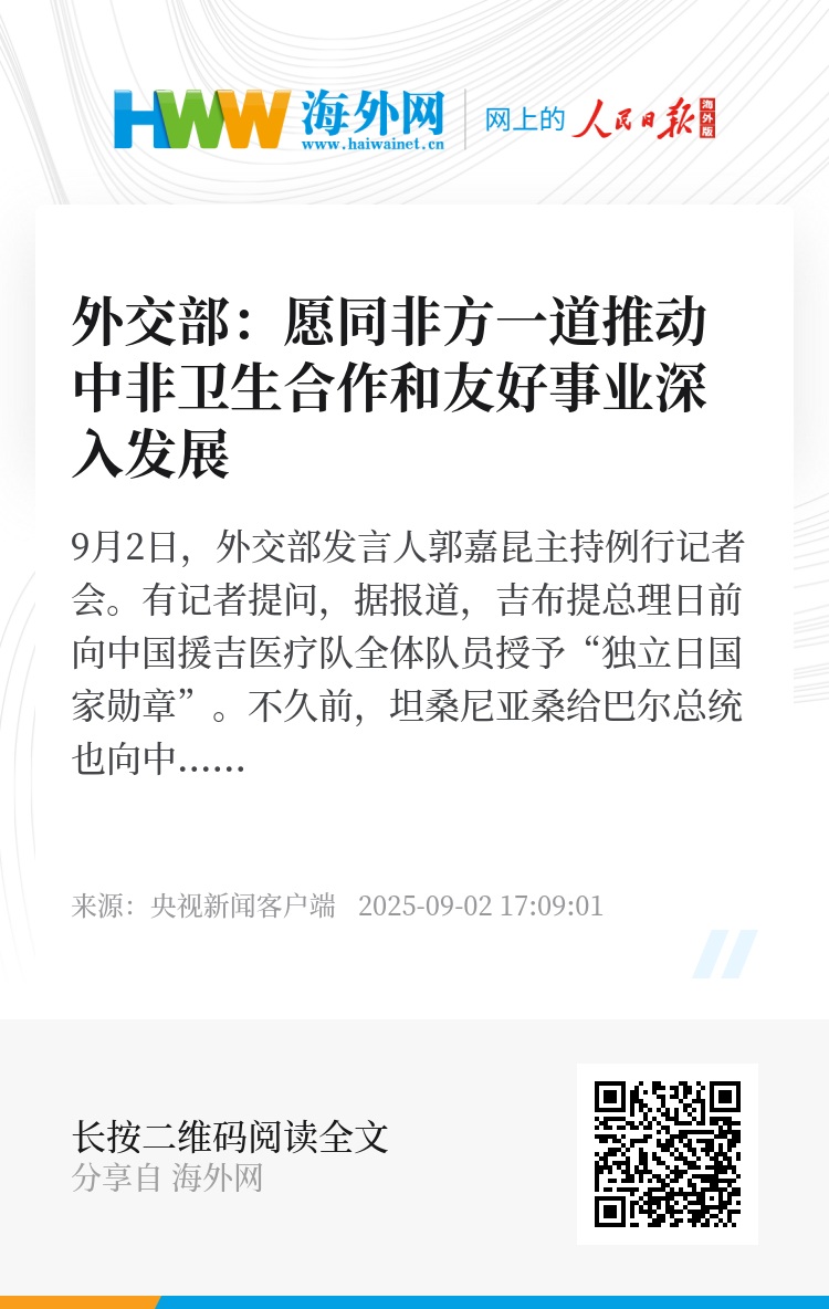 9月2日,外交部发言人郭嘉昆主持例行记者会。有记者提问,据报道,吉布提总理日前向中国援吉医疗队全体队员授予“独立日国家勋章”。不久前,坦桑尼亚桑给巴尔总统也向中国援桑医疗队授勋。发言人对此有何评论?