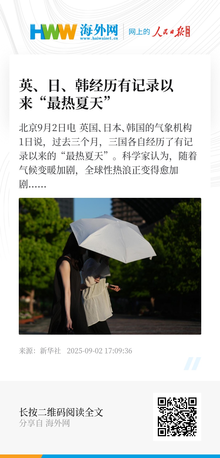 新华社北京9月2日电 英国、日本、韩国的气象机构1日说,过去三个月,三国各自经历了有记录以来的“最热夏天”。科学家认为,随着气候变暖加剧,全球性热浪正变得愈加剧烈且频繁。