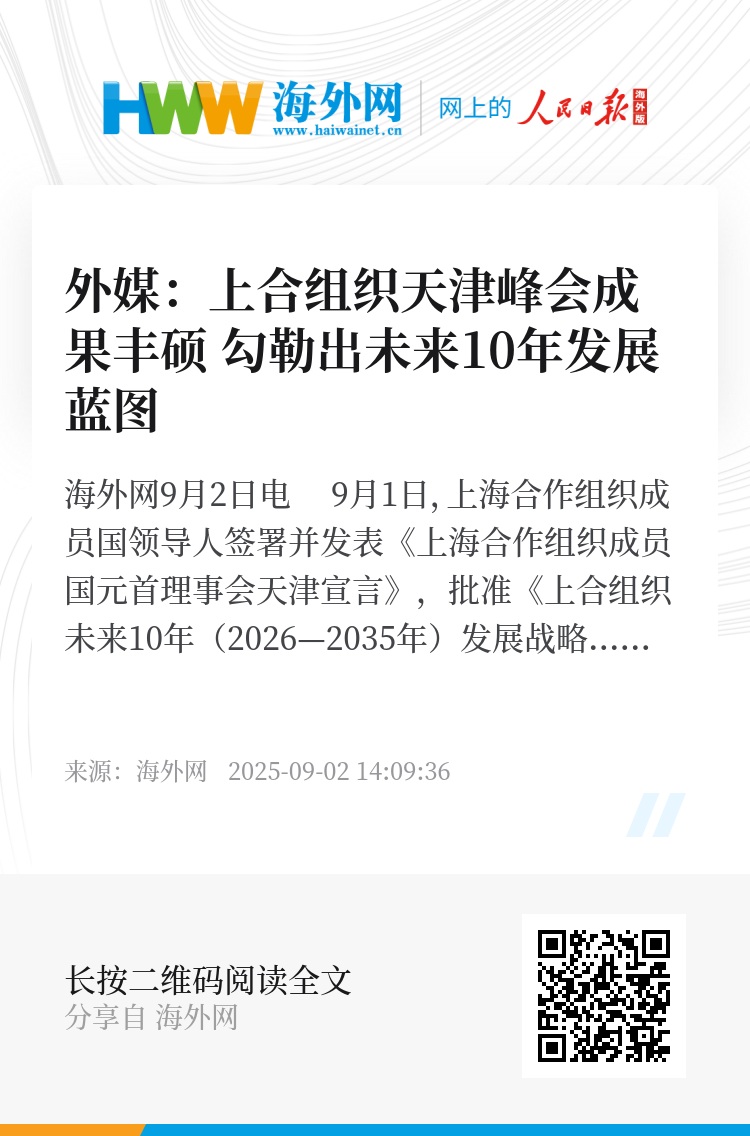 海外网9月2日电 9月1日,上海合作组织成员国领导人签署并发表《上海合作组织成员国元首理事会天津宣言》,批准《上合组织未来10年(2026—2035年)发展战略》。成员国媒体表示,此次峰会勾勒出了上合组织未来10年的发展蓝图。
