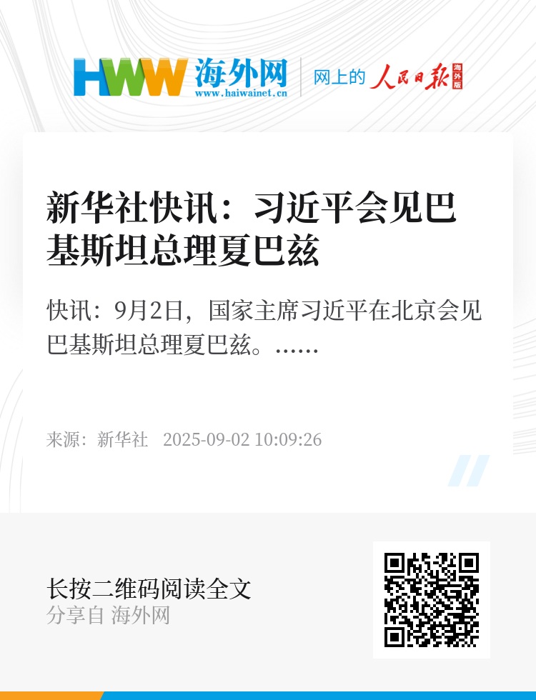 新华社快讯:9月2日,国家主席习近平在北京会见巴基斯坦总理夏巴兹。