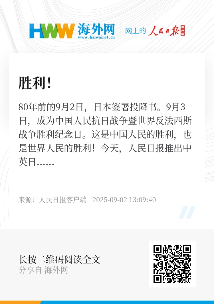 80年前的9月2日,日本签署投降书。9月3日,成为中国人民抗日战争暨世界反法西斯战争胜利纪念日。这是中国人民的胜利,也是世界人民的胜利!今天,人民日报推出中英日三语种主题片《胜利》。此刻,共同传递:珍视和平,命运与共,开创未来,吾辈自强!
