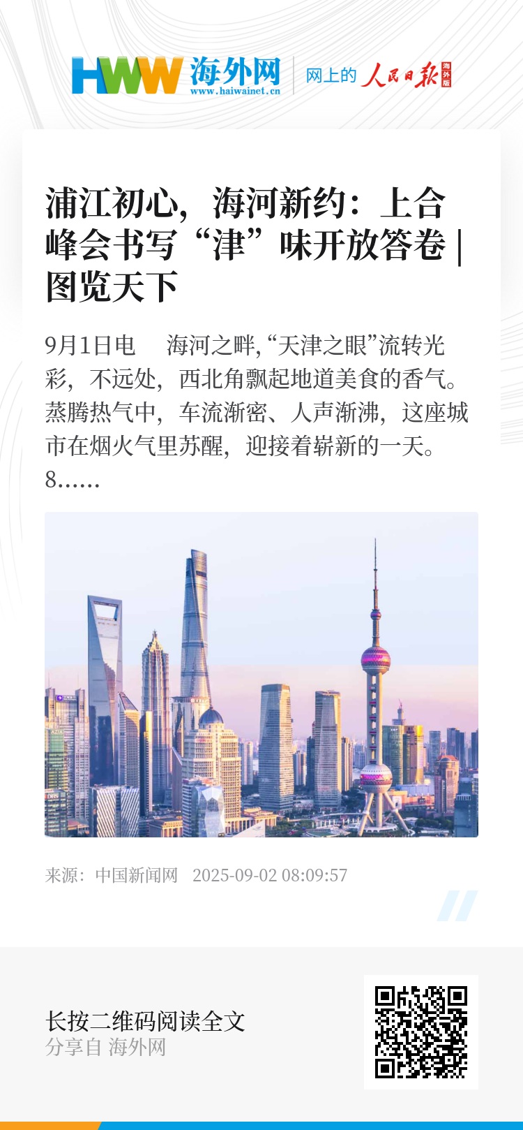 始终秉持开放合作理念,上合组织持续推动成员国及世界各国多领域协同发展。此次携手天津,上合组织将依托其产业、创新、文化等优势,书写高水平对外开放促高质量发展的“津”彩篇章。
