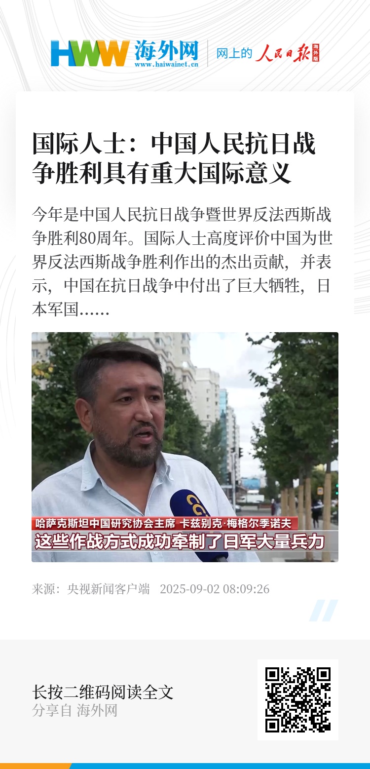 哈萨克斯坦中国研究协会主席 卡兹别克·梅格尔季诺夫:中国人民早于其他盟军在本土展开了艰苦卓绝的战斗,中国对二战胜利的战略贡献至关重要。中国在战争初期就清醒认识到抵御日本侵略的重要性,开展了游击战、防御战和持久战,这些作战方式成功牵制了日军大量兵力。日本至今仍未承认在中国犯下的罪行,正因如此,我们必须清醒认识到,任何历史悲剧都应被正视,中国在二战中的贡献更应得到充分承认。