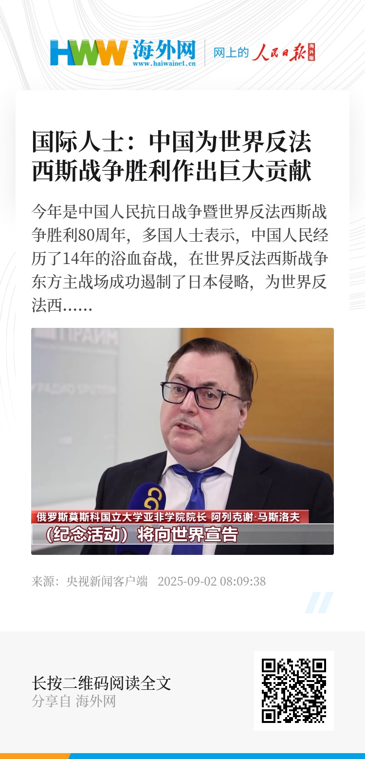 俄罗斯莫斯科国立大学亚非学院院长 阿列克谢·马斯洛夫:纪念活动将向世界宣告,这段历史不能被遗忘。中国凭借自身的力量将日军主力牵制在中国境内,这是日本未能对苏联发起军事进攻的关键原因之一。