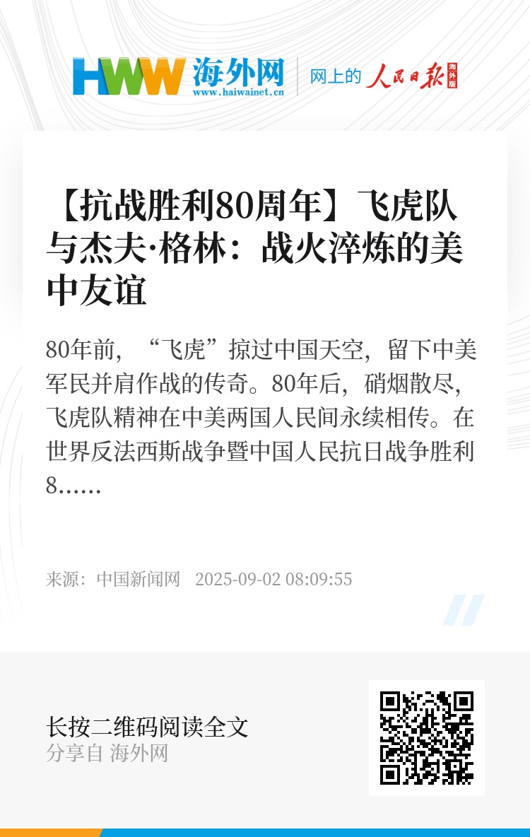 在世界反法西斯战争暨中国人民抗日战争胜利80周年之际,美中航空遗产基金会主席杰夫·格林率队访问中国多地,开展“飞虎队友谊学校青年学生友好交流活动”。队伍中有飞虎队老兵后代,有美国飞虎队友谊学校师生。近日,中新社记者专访杰夫·格林,听他讲述跨越80年的飞虎情缘。(记者 刘鸿鹤 制作 周璟)