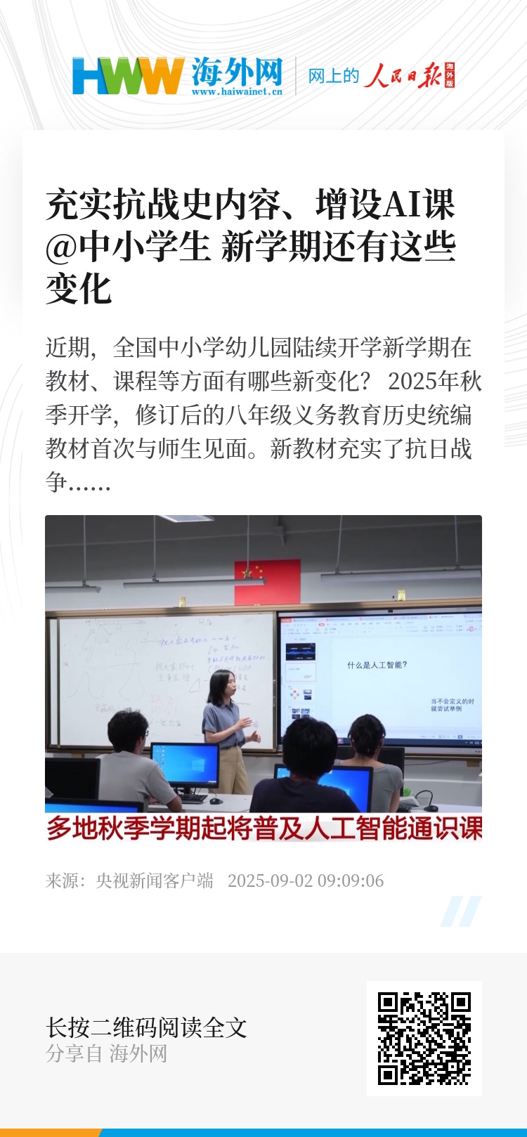 此外,今年秋季学期起,北京、天津、杭州、西安等多地发文明确:在中小学各学段探索开展人工智能通识课程教育。其中北京市将实现人工智能通识课程全覆盖,每学年不少于8课时。
