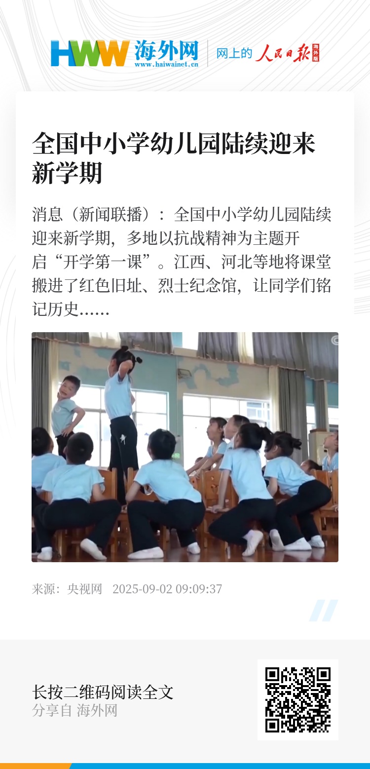 央视网消息(新闻联播):全国中小学幼儿园陆续迎来新学期,多地以抗战精神为主题开启“开学第一课”。江西、河北等地将课堂搬进了红色旧址、烈士纪念馆,让同学们铭记历史、缅怀先烈;福建、贵州等地组织学生走进影院剧场,沉浸式感悟烽火岁月;广西、江苏等地则以“抗战老兵讲故事”等形式,弘扬抗战精神、厚植家国情怀。