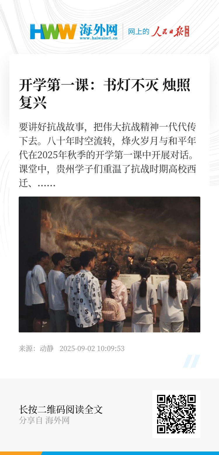 讲好抗战故事,把伟大抗战精神一代代传下去。这些形式多样、内容丰富的“开学第一课”活动,不仅让学生们了解了抗战历史,更在他们心中播下了爱国主义的种子。书灯不灭,烛照复兴,这是历史的回响,更是未来的召唤。在新时代的征程中,抗战精神将继续激励贵州广大青少年坚定理想信念、厚植家国情怀,为实现中华民族的伟大复兴贡献青春力量。