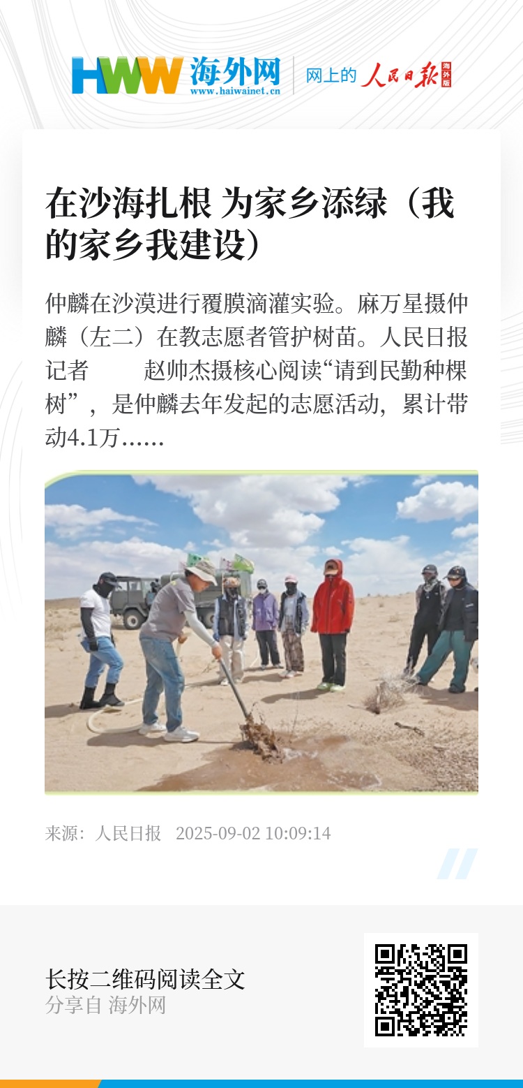 如今,仲麟和团队通过电商建立“产业反哺治沙”机制,“每卖一箱瓜果,就有70%的利润投入治沙”。基地留言板上,写满志愿者的心声:“向下扎根的是树苗,向上生长的是希望”“又做了一件有意义的事,明年我再来”……