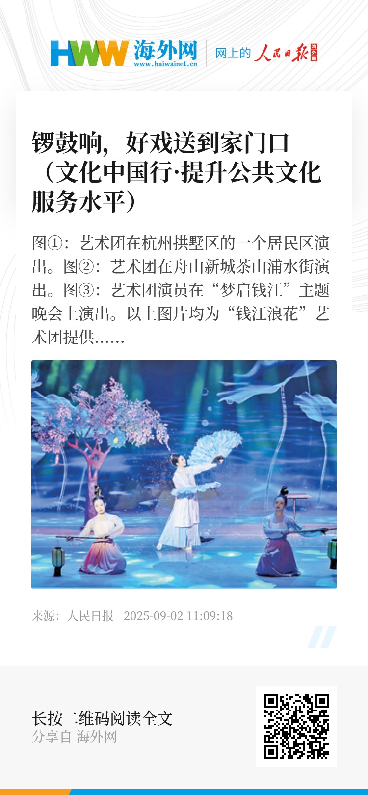 从村里几年也没一次专业演出,到在家门口就能看丰富多彩的节目,20年来,浙江“钱江浪花”艺术团坚持送戏下乡,不断创新展演形式、充实演出队伍,用艺术浸润乡土,把优质文化资源送到基层。让我们在“浪花”奔涌中聆听文化与乡村双向奔赴的回声。