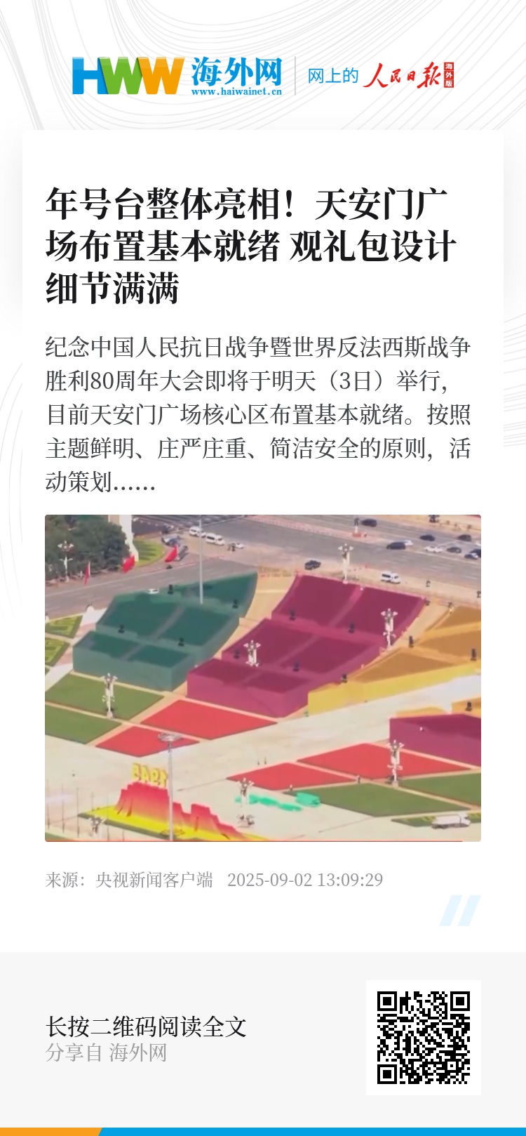 纪念中国人民抗日战争暨世界反法西斯战争胜利80周年大会即将于明天(3日)举行,目前天安门广场核心区布置基本就绪。按照主题鲜明、庄严庄重、简洁安全的原则,活动策划团队在上百个设计方案中反复研讨挑选、细化落实,最终年号台的呈现,让人眼前一亮。