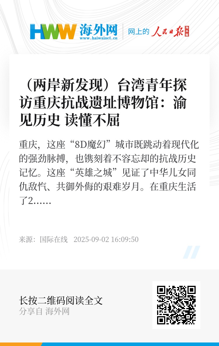 2025年是中国人民抗日战争暨世界反法西斯战争胜利80周年,也是台湾光复80周年。海峡飞虹中文网《两岸新发现》推出“我们共同的抗战记忆”系列节目。台湾青年走访抗战遗址、参观文物史料、聆听烈士后代口述,重温先烈浴血奋战的抗战故事,感受中华儿女抵御外侮的不屈精神,触摸中华民族抗战的历史脉络,追寻两岸同胞共同的抗战记忆。那些被海风吹散的记忆碎片,终将被青春之手重新拼合。让我们携手同行,共同绘就中华民族伟大复兴的壮美画卷。