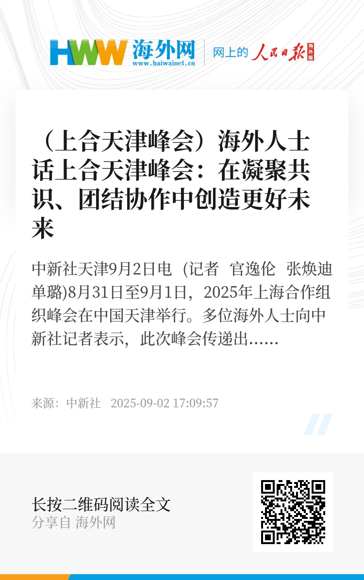 中新社天津9月2日电 (记者 官逸伦 张焕迪 单璐)8月31日至9月1日,2025年上海合作组织峰会在中国天津举行。多位海外人士向中新社记者表示,此次峰会传递出凝聚共识、团结协作的信号,相信人们能以此创造更美好的未来。