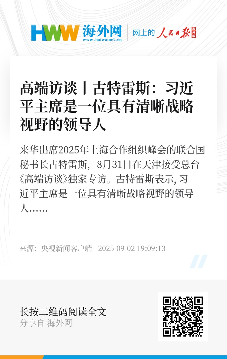 来华出席2025年上海合作组织峰会的联合国秘书长古特雷斯,8月31日在天津接受总台《高端访谈》独家专访。