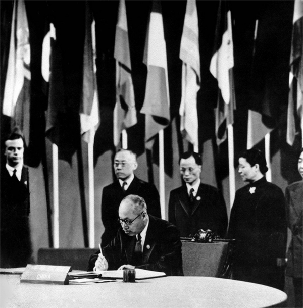 抗日战争的胜利,让中国一雪近代以来的百年耻辱,重新确立了中国在世界上的大国地位,成为联合国安理会5个常任理事国之一,赢得了在战后政治经济秩序建构上的话语权。图为1945年6月在美国旧金山,中国代表团成员、中国共产党代表董必武在《联合国宪章》上签字。 新华社发