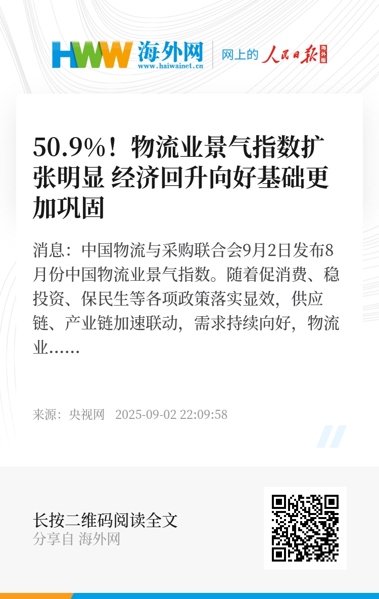 央视网消息:中国物流与采购联合会9月2日发布8月份中国物流业景气指数。随着促消费、稳投资、保民生等各项政策落实显效,供应链、产业链加速联动,需求持续向好,物流业景气指数扩张明显。