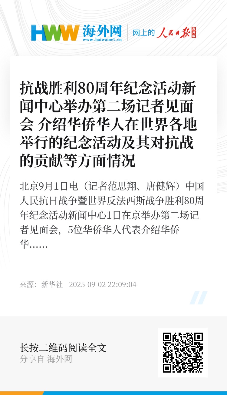 新华社北京9月1日电(记者范思翔、唐健辉)中国人民抗日战争暨世界反法西斯战争胜利80周年纪念活动新闻中心1日在京举办第二场记者见面会,5位华侨华人代表介绍华侨华人在世界各地举行的纪念活动及其对抗战的贡献等方面情况,并回答记者提问。