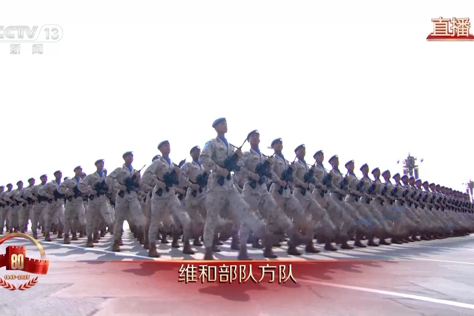 维护世界和平,贡献中国力量。维和部队方队接受检阅。