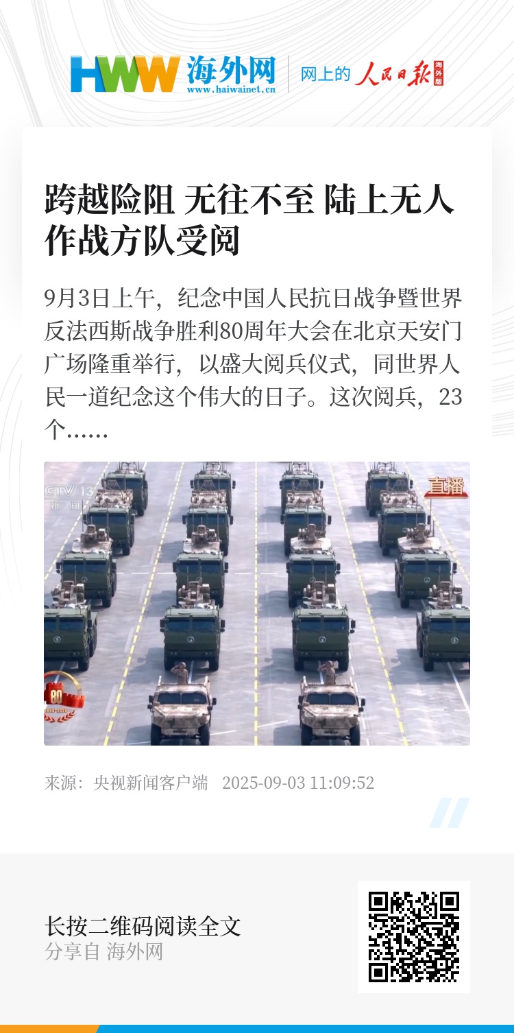 跨越险阻,无往不至。侦打突击、扫雷排爆、班组支援等无人战车,远程操控、自主行动、灵活编组,实现陆上有人无人协同作战新突破。
