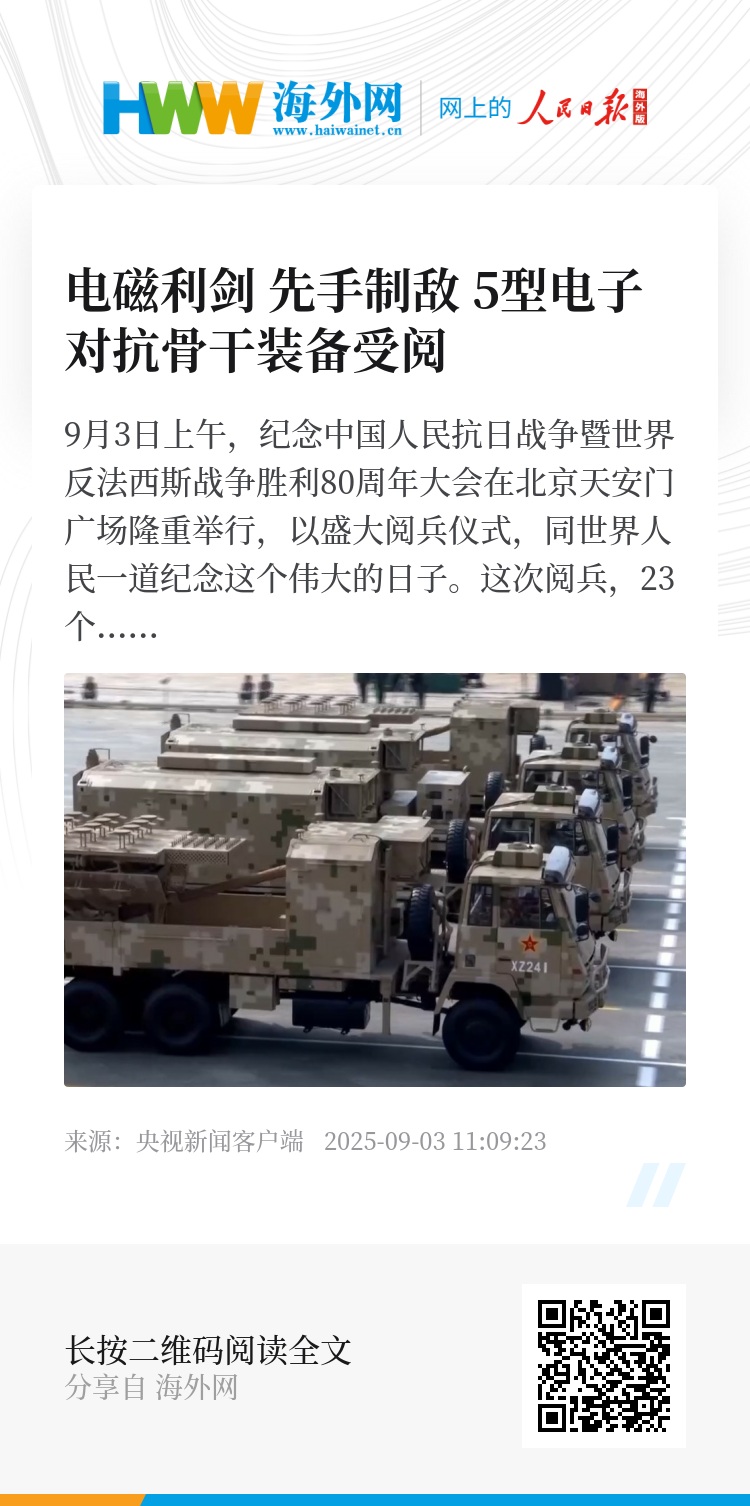 电磁利剑,先手制敌。受阅的5型电子对抗骨干装备,全频侦控、精准压制,具备空天防抗、破网断链作战能力,是制胜多域联合战场的利器。