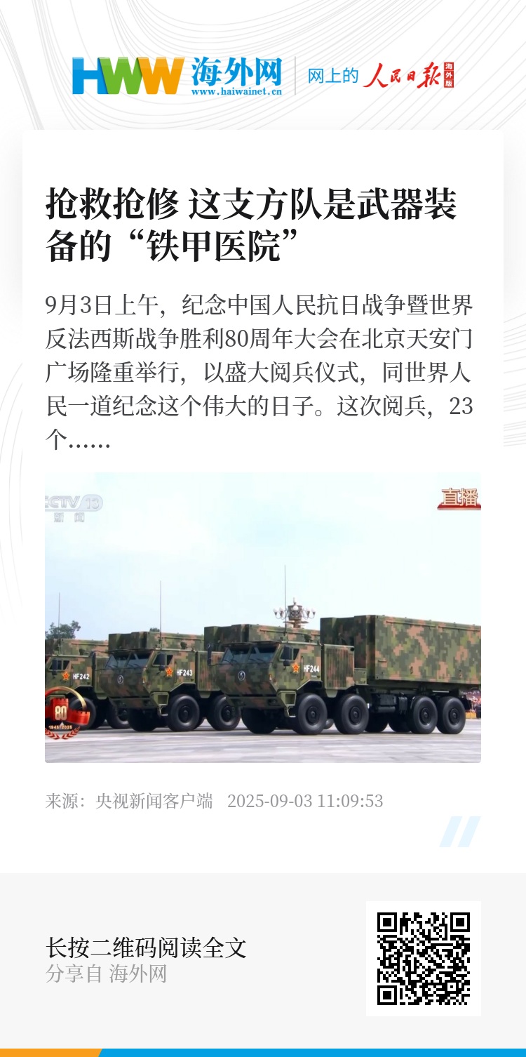 这次阅兵,23个装备方队分为7个作战群,后装保障群2个方队之装备保障方队接受检阅。