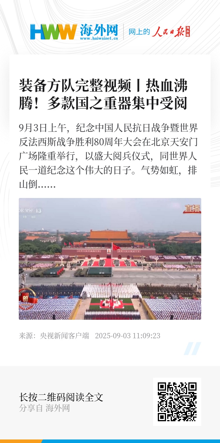 9月3日上午,纪念中国人民抗日战争暨世界反法西斯战争胜利80周年大会在北京天安门广场隆重举行,以盛大阅兵仪式,同世界人民一道纪念这个伟大的日子。
