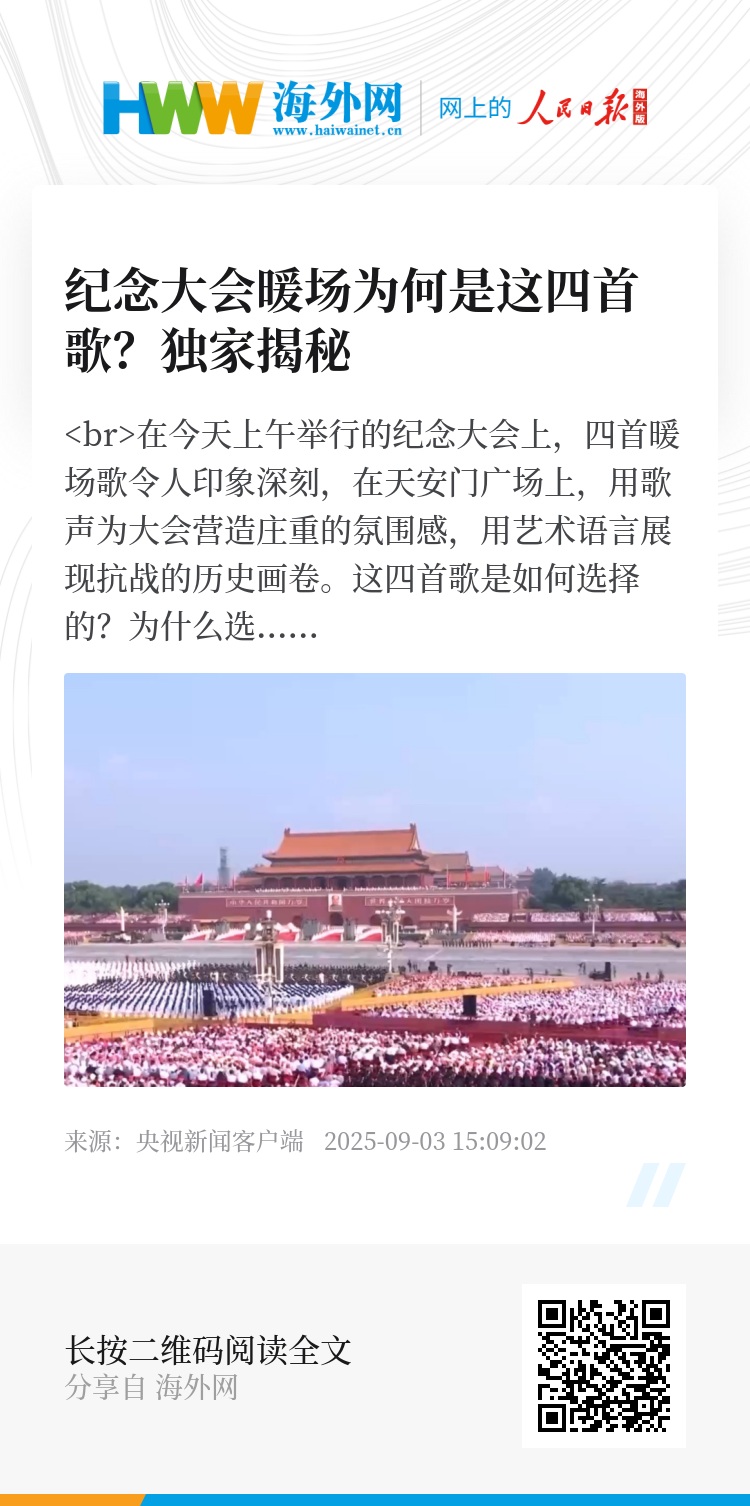 在今天上午举行的纪念大会上,四首暖场歌令人印象深刻,在天安门广场上,用歌声为大会营造庄重的氛围感,用艺术语言展现抗战的历史画卷。这四首歌是如何选择的?为什么选择这几首歌?