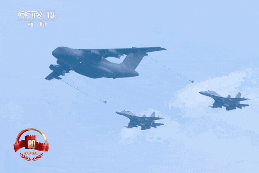 阅兵现场,为战鹰助力,为胜利续航,加受油机梯队飞临天安门上空,三架运油-20A时刻准备为轰-6N、歼-16、歼-20飞机加油。