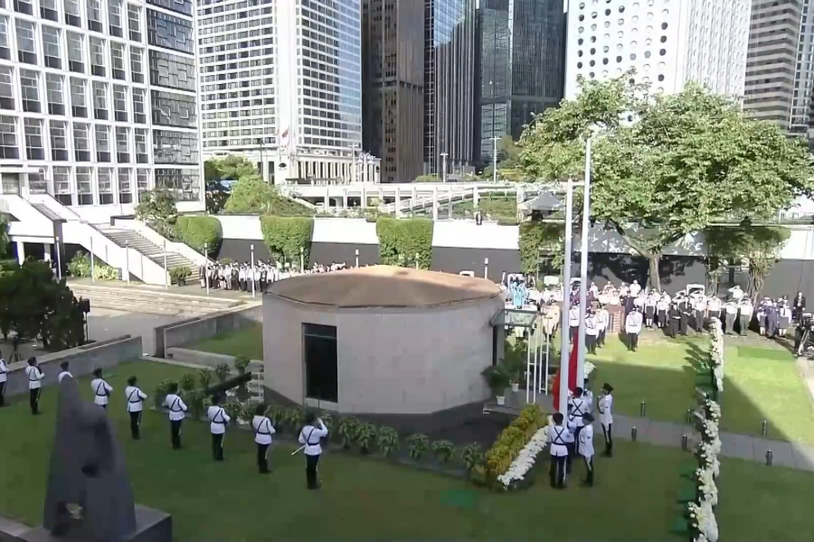 仪式当天8时开始,全场肃立,现场奏唱国歌,升旗队将国旗和区旗升起。警察步枪仪仗队鸣枪致敬。