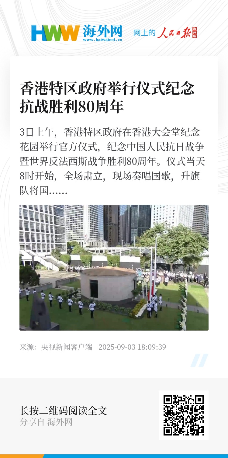 3日上午,香港特区政府在香港大会堂纪念花园举行官方仪式,纪念中国人民抗日战争暨世界反法西斯战争胜利80周年。