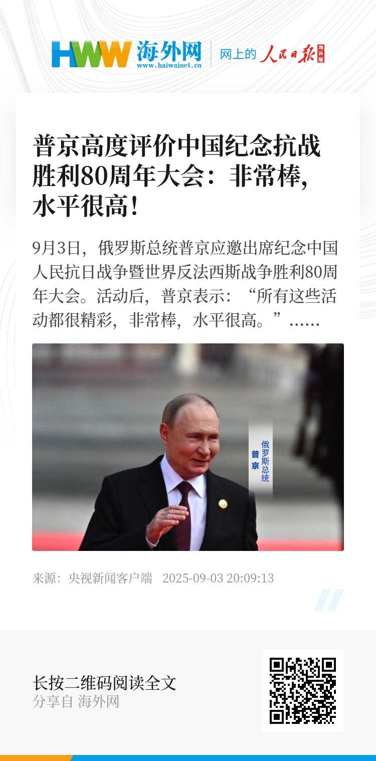 9月3日,俄罗斯总统普京应邀出席纪念中国人民抗日战争暨世界反法西斯战争胜利80周年大会。活动后,普京表示:“所有这些活动都很精彩,非常棒,水平很高。”