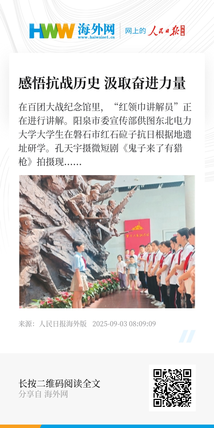与抗战相关的纪念设施、遗址遗迹和爱国主义教育基地、国防教育基地等迎来参观热潮。在位于山西省阳泉市的百团大战纪念馆里,一件件文物诉说着历史,一场场讲解传递着力量——