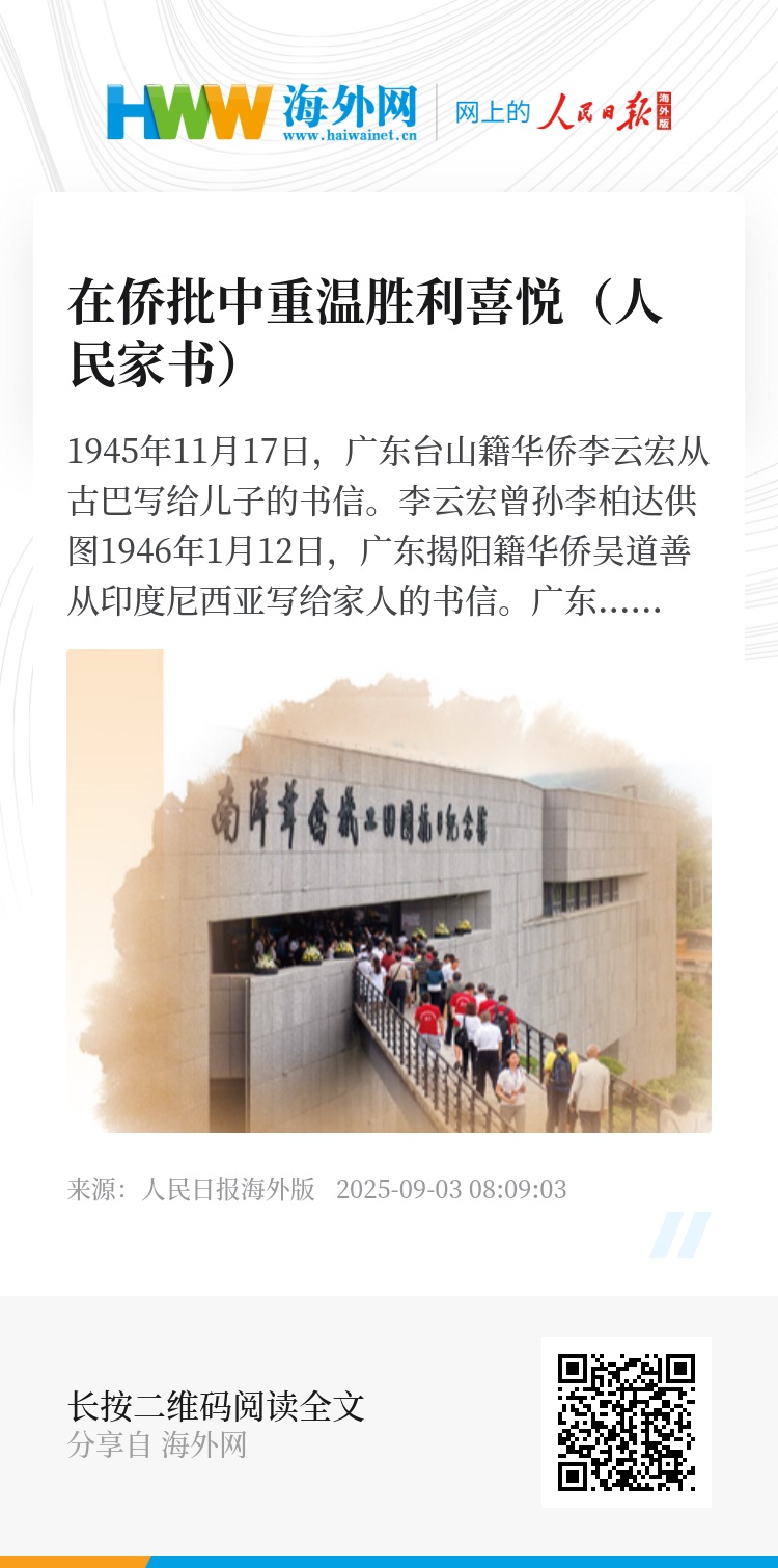 值此纪念中国人民抗日战争暨世界反法西斯战争胜利80周年之际,人民日报海外版推出“人民家书”之“胜利侨批”,遴选海外华侨在抗战胜利后写给家人的4封侨批,让我们一起聆听当年海外华侨欢庆胜利的澎湃心声,品读海外华侨对祖国发展、民族复兴的深切热望。