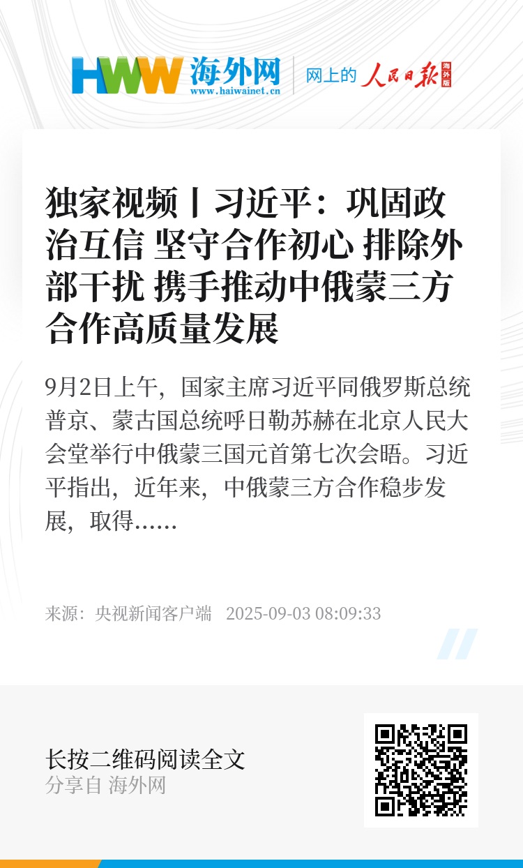 习近平指出,近年来,中俄蒙三方合作稳步发展,取得实实在在的成果。三方合作中期路线图顺利实施,三国贸易额节节攀升,经贸、科技、生态保护、人文合作不断深化。作为山水相连、休戚与共的友好邻邦,中方愿同俄方、蒙方一道,坚守合作初心,排除外部干扰,携手推动三方合作高质量发展。