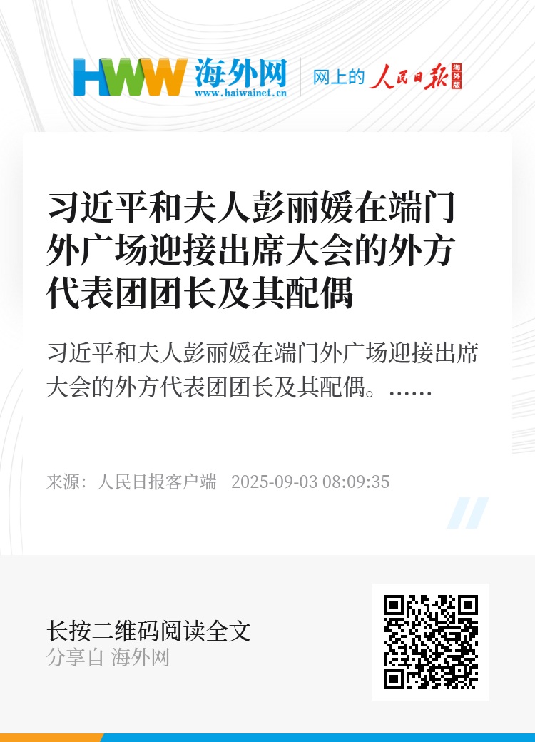 习近平和夫人彭丽媛在端门外广场迎接出席大会的外方代表团团长及其配偶。