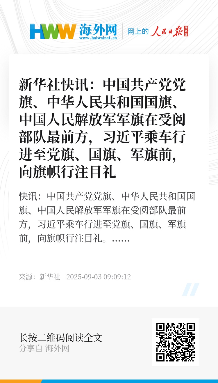 新华社快讯:中国共产党党旗、中华人民共和国国旗、中国人民解放军军旗在受阅部队最前方,习近平乘车行进至党旗、国旗、军旗前,向旗帜行注目礼