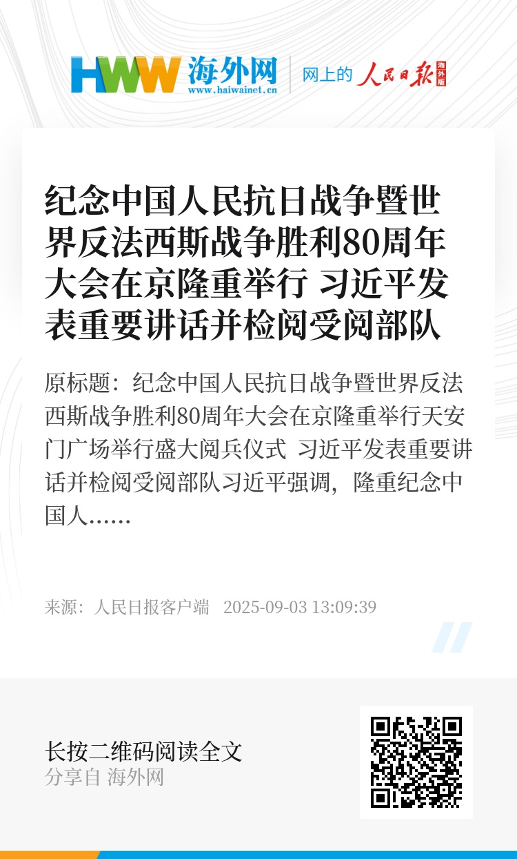 铭记伟大历史胜利,凝聚正义和平力量。9月3日上午,纪念中国人民抗日战争暨世界反法西斯战争胜利80周年大会在北京天安门广场隆重举行,以盛大阅兵仪式,同世界人民一道纪念这个伟大的日子,共同开创更加光明的未来。中共中央总书记、国家主席、中央军委主席习近平发表重要讲话并检阅受阅部队。